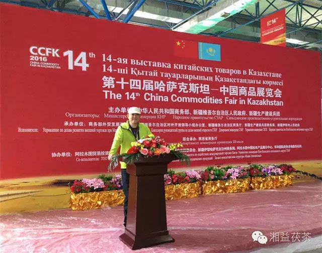 第十四屆哈薩克斯坦——中國商品展覽會(huì )于2016年5月20日在哈薩克斯坦阿拉木圖市隆重開(kāi)幕。為積極落實(shí)中央關(guān)于加快推進(jìn)絲綢之路經(jīng)濟帶建設,加大企業(yè)開(kāi)拓中亞新興茶葉市場(chǎng),提升湘益茯茶在中亞各國的品牌優(yōu)勢,新疆新益茶業(yè)有限責任公司做為兵團代表之一向國外客商及消費者展示了湘益牌系列茯磚茶產(chǎn)品并受到一致好評。