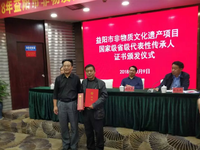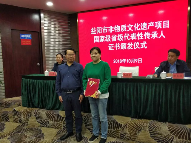 圖為湖南省文化廳非物質(zhì)文化遺產(chǎn)項目處竇雪松處長(cháng)為劉杏益頒發(fā)證書(shū)
