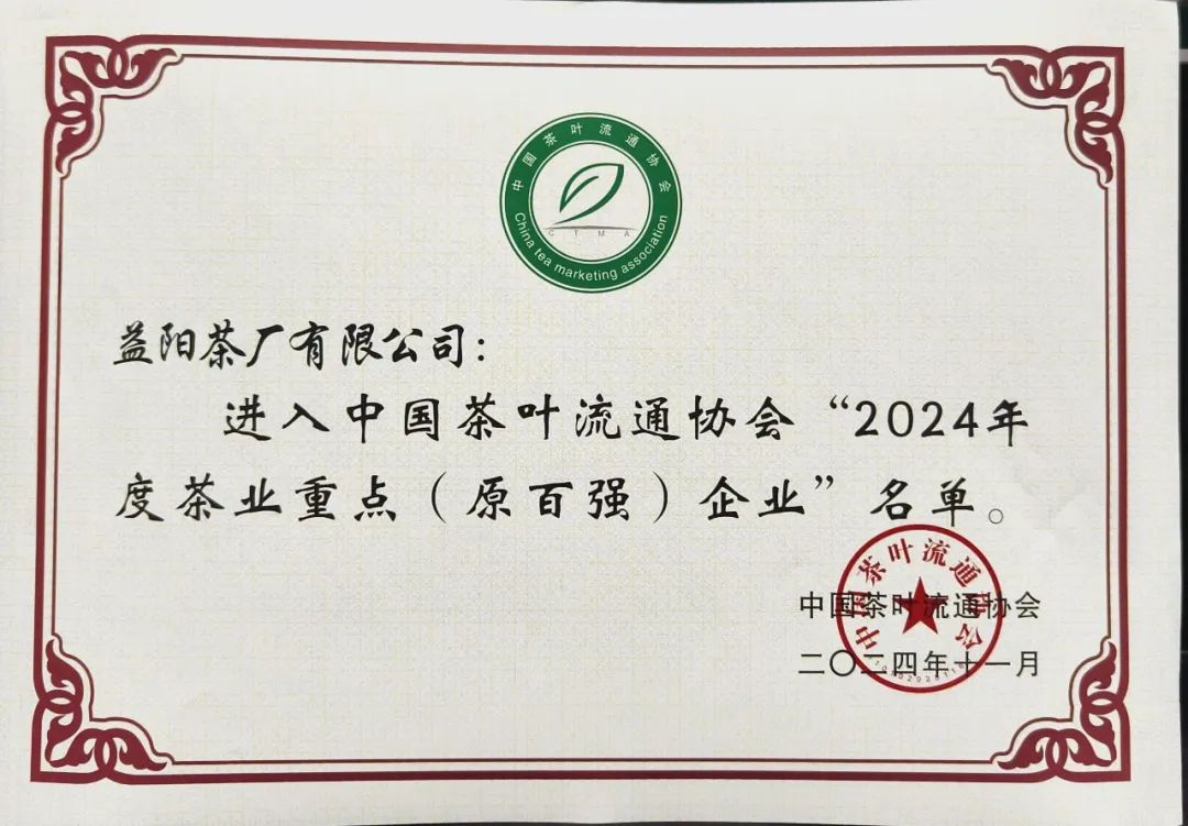 益陽(yáng)茶廠(chǎng)有限公司榮獲“2024年度茶業(yè)重點(diǎn)企業(yè)”